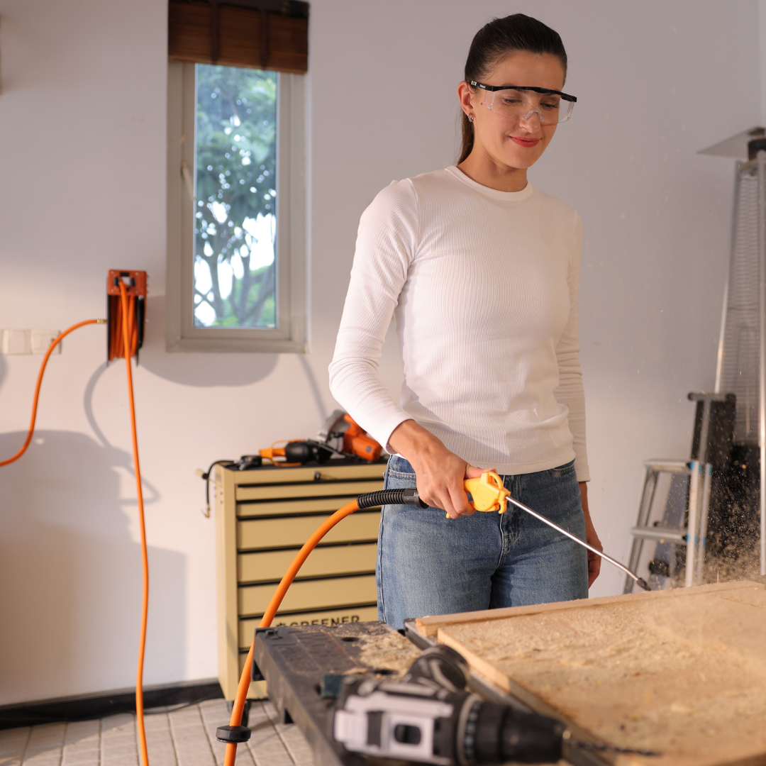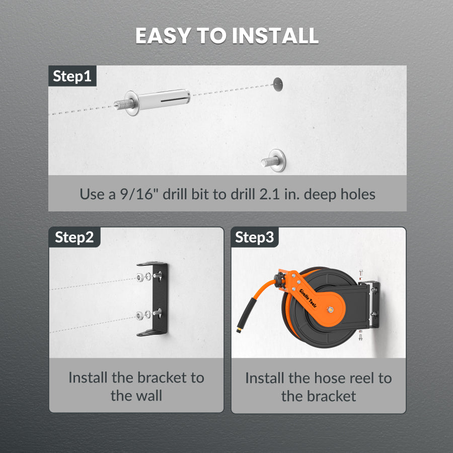 Giraffe Tools air compressor hose reel has a professional-grade all-steel construction, corrosion-resistant powder coat finish for long life and durability.