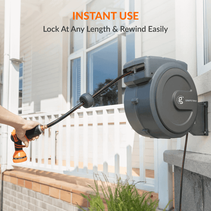 The auto-rewind system, hose locker and 9-mode hose nozzle make the hose reel more convenient to use.