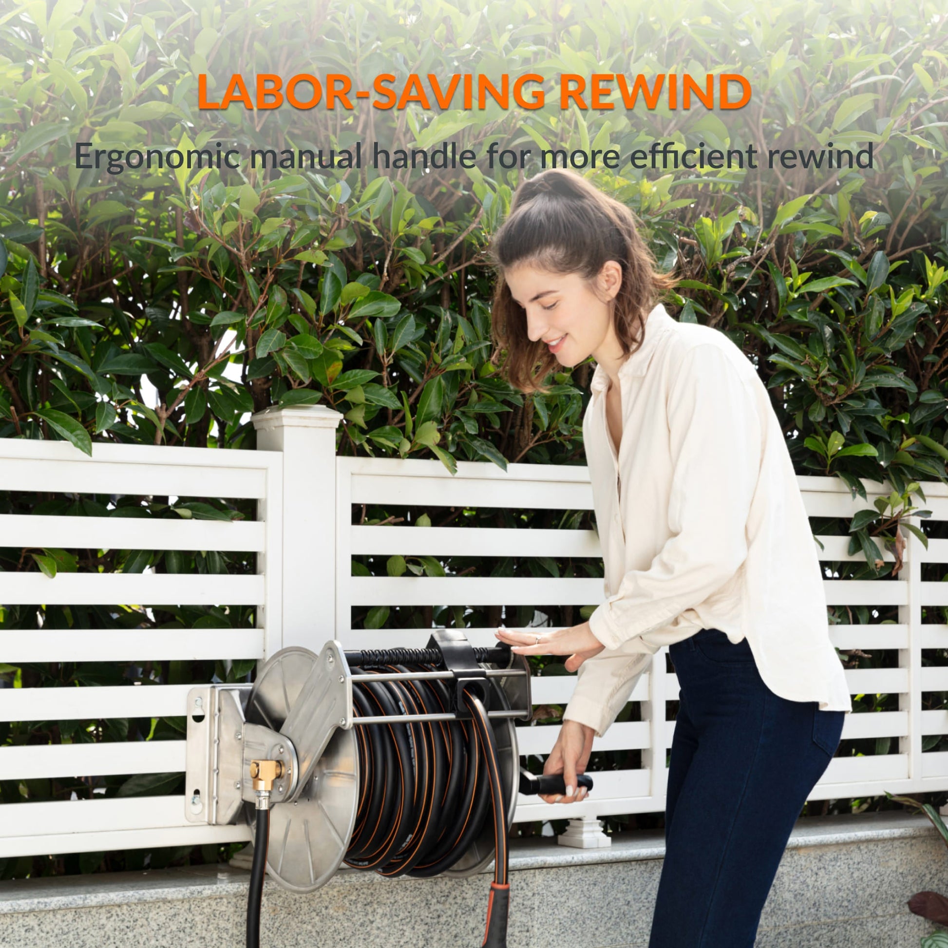 The Giraffe Tools Stainless Steel Hose Reel is made of industrial-grade 304 stainless steel. The crank and solid wall-mounted reel make it very easy to install and use.